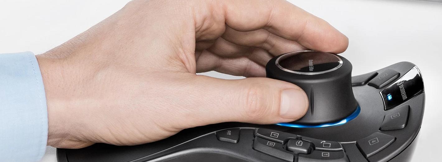 Trabajar con ambas manos —con un ratón 3D en la mano izquierda y un ratón convencional en la derecha— no solo previene estos síntomas, sino que además aumenta considerablemente la eficiencia y la ergonomía del flujo de trabajo*.